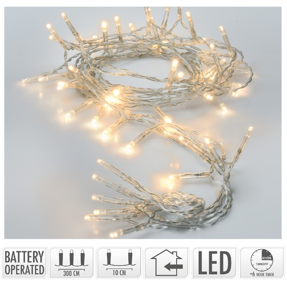 Fényfüzér 30 LED-es transparens  időzítős elemes (elem nélkül) meleg 300cm