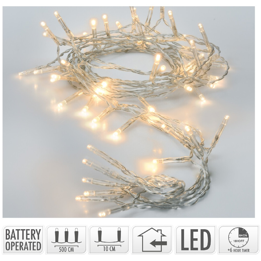 Fényfüzér 50 LED-es transparens  időzítős elemes (elem nélkül) meleg  500cm