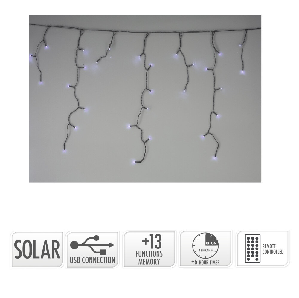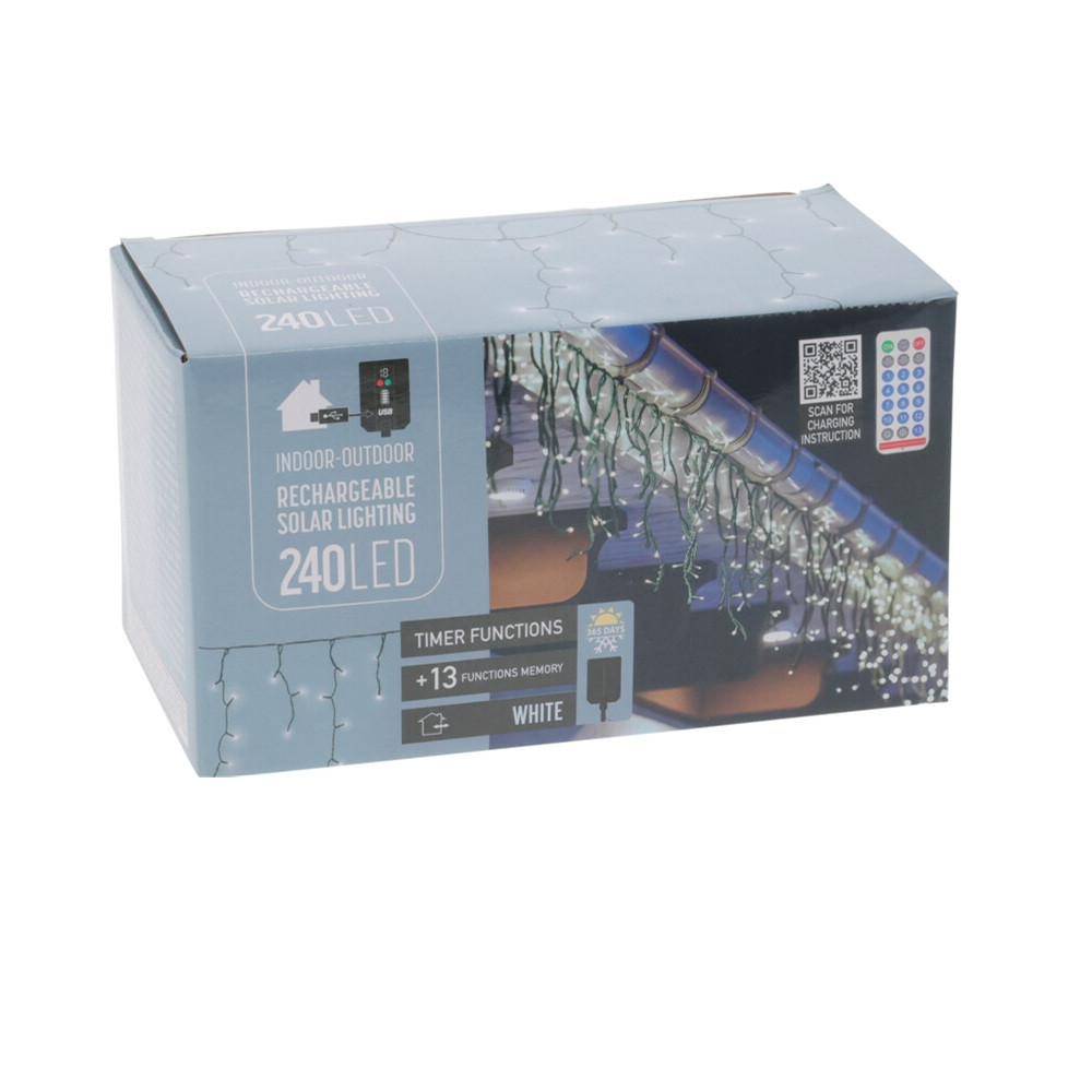Napelemes fényfüzér 240 LED-es időzítős tölthetős távirányítós hideg 8m