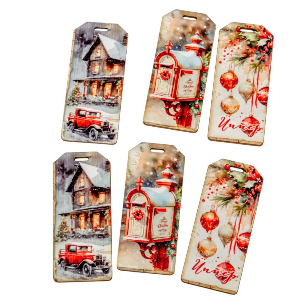 Nyomtatott dekorkarton Karácsonyi piros téma biléta 5,5cm 6db-os