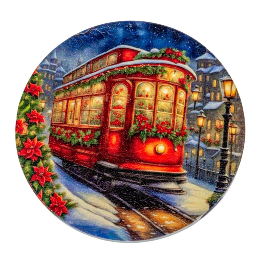 Nyomtatott fa tábla koszorú közép Karácsonyi villamos 11,8cm
