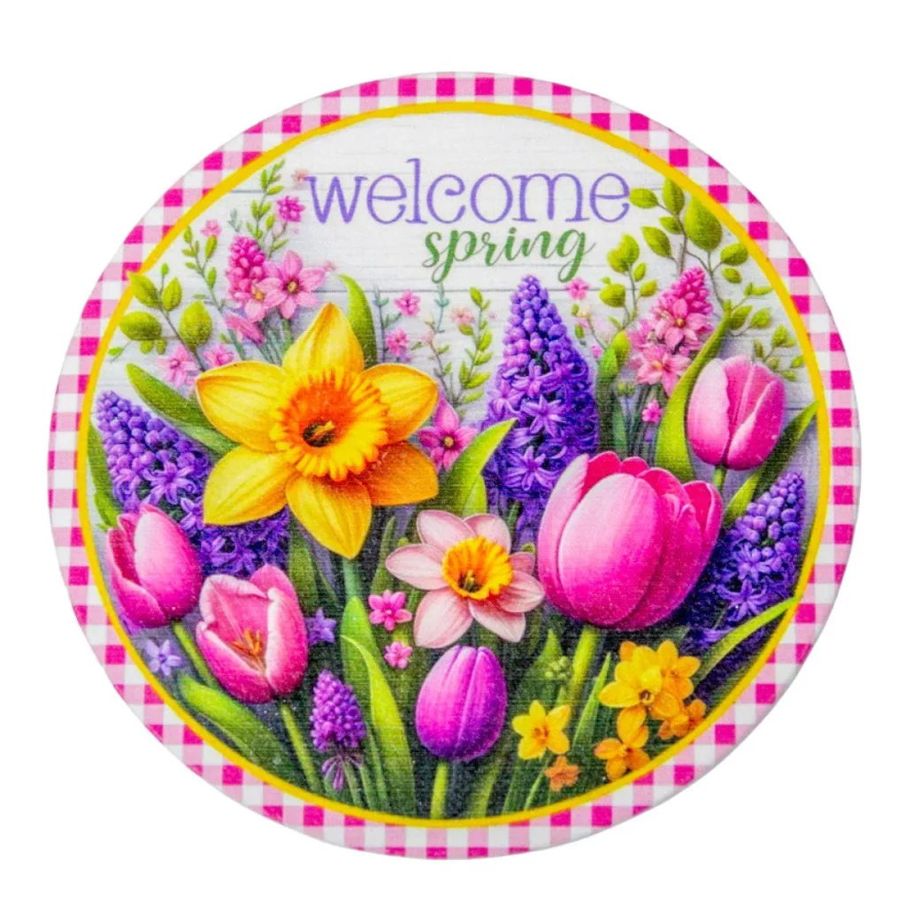 Nyomtatott fa tábla koszorú közép - Welcome Spring 11,8cm