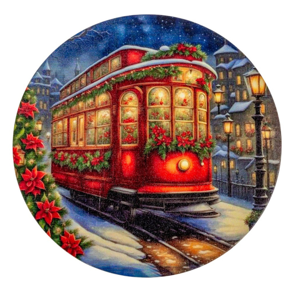 Nyomtatott fa tábla koszorú közép Karácsonyi villamos 14,8cm